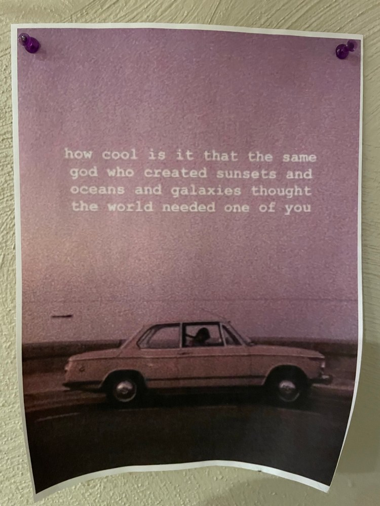 “I believe it delights God that every single one of God’s children has their own beliefs. If God wished us all to believe exactly the same things, that would be a lesser god, and your poster in my kitchen, “the world needed one of you,” would be crap. You might not enjoy seeing all the people you’ll see on your first day back today, and I sure as hell can’t understand many things about the world, but I believe God thinks the world needs all of them too. Not everything can be sugarcoated, but I believe entirely that our world is oozing with goodness, and you make it safer for me to believe that.”